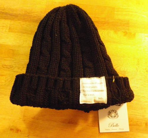 【BELLO】この冬オススメのケーブル編みのワッチ帽。肉厚に編まれたニット帽に縫い込まれたブランドタグが雰囲気あります。