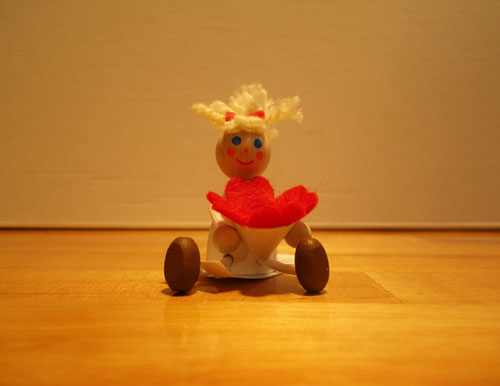 「森の国」チェコでつくられたハンドメイドのミニチュア人形。木のぬくもり、色合いに癒されます。大きさは高さ約5センチ程度(座った状態)。木、フェルト、ひもで作られています。