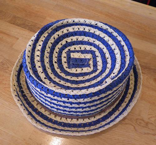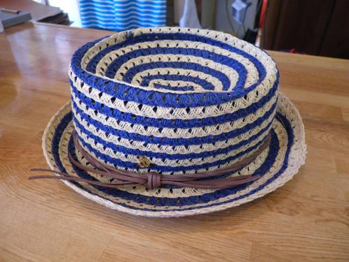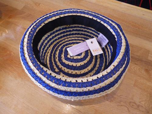 2色のしましまのブレードが涼しげで、カジュアルマリンスタイルにぴったり。ちらりと見えるブリムの裏側は単色になっていて、全体を引き締めます。