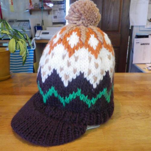 定番のボンボンつきツバありニット。柄がポップでニットの温かみが感じられるデザイン。