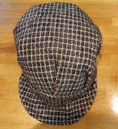 ユニセックスのワンパネルのキャップを、大人の女性っぽいキラキラのはいったツイードで仕上げました。